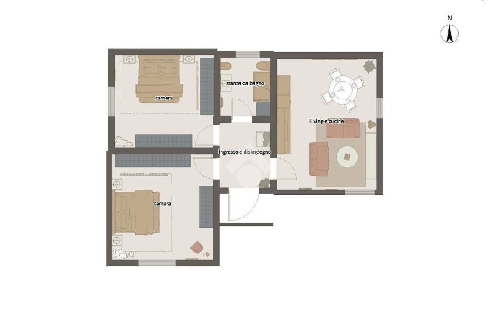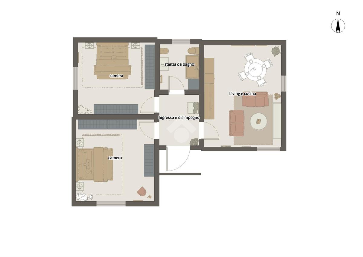 Al piano superiore troviamo invece la cucina abitabile, il secondo bagno e due camere da letto.